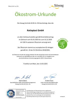 ratioplast GmbH setzt sich mit dem Thema Ressourcen im Bereich Kunststoff und deren Endlichkeit auseinander. Wir sehen unseren Weg sowohl im Einsatz von Rezyklat aus Industrie- und Konsumentenabfällen als auch im Einsatz von biobasierten Kunststoffen aus nachwachsenden Ressourcen.